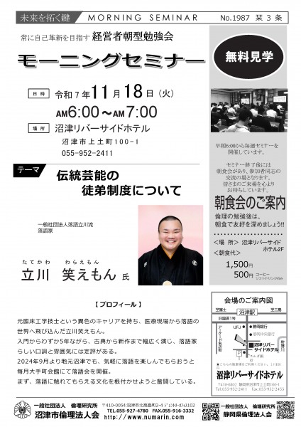 | 11月18日 | 立川笑えもん 氏 | (一社)落語立川流、落語家 伝統芸能の徒弟制度について |