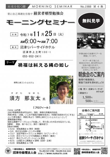 | 11月25日 | 須方 那友太 氏 | 教育と命コンシェルジュ 禍福は糾える縄のごとし |