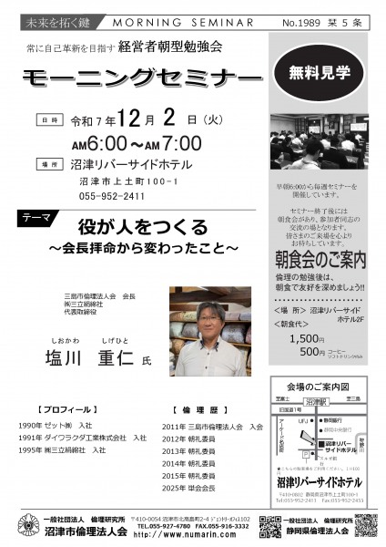 | 12月02日 | 塩川 重仁 氏 | 三島市倫理法人会 会長 (株)三立絹綿社 代表取締役 役が人をつくる~会長拝命から変わったこと~ |