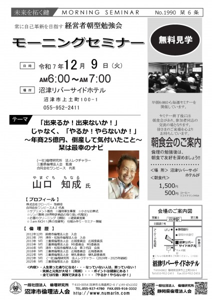 | 12月09日 | 山口 知成 氏 | 三重県倫理法人会 監査 法人レクチャラー、(同)ワンピースAZ 代表 「出来るか!出来ないか!」じゃなく、「やるか!やらないか!」 ~年商25億円、倒産して気付いたこと~ |