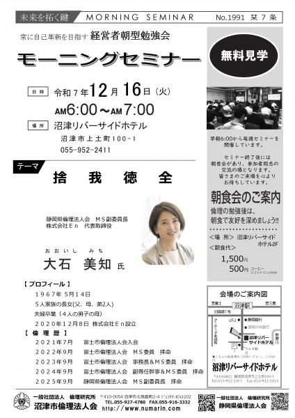 | 12月16日 | 大石 美智 氏 | 静岡県倫理法人会 モーニングセミナー副委員長、(株)En 代表取締役 捨我得全 |