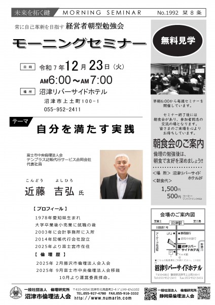 | 12月23日 | 近藤 吉弘 氏 | 富士市中央倫理法人会、テンプラス記帳代行サービス(同) 代表社員 自分を満たす実践 |
