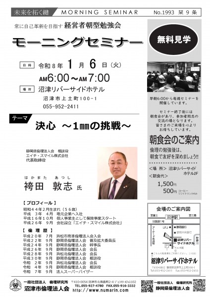 | 01月06日 | 袴田 敦志 氏 | 静岡県倫理法人会 相談役,エイチ・スマイル株式会社 代表取締役 決心~1㎜の挑戦~ |