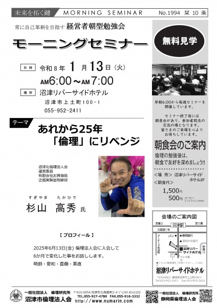 | 01月13日 | 杉山 高秀 氏 | 沼津北倫理法人会 運営委員、有限会社お買得処 企画実験室取締役 あれから25年「倫理」にリベンジ |