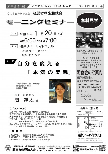 | 01月20日 | 関 幹太 氏 | 三島市倫理法人会 専任幹事、合同会社KUREBA 業務執行社員 自分を変える「本気の実践」 |