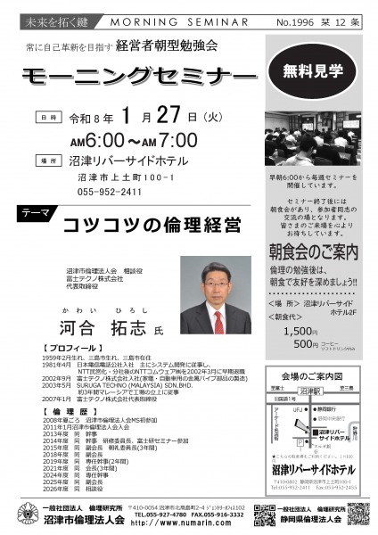 | 01月27日 | 河合 拓志 氏 | 沼津市倫理法人会 相談役、富士テクノ株式会社 代表取締役 コツコツの倫理経営 |
