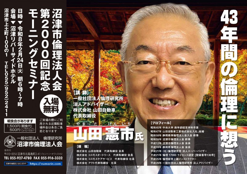 | 02月24日 | 山田 憲市 氏 | (一社)倫理研究所 法人アドバイザー 43年間の倫理に想う|2,000回記念モーニングセミナー |