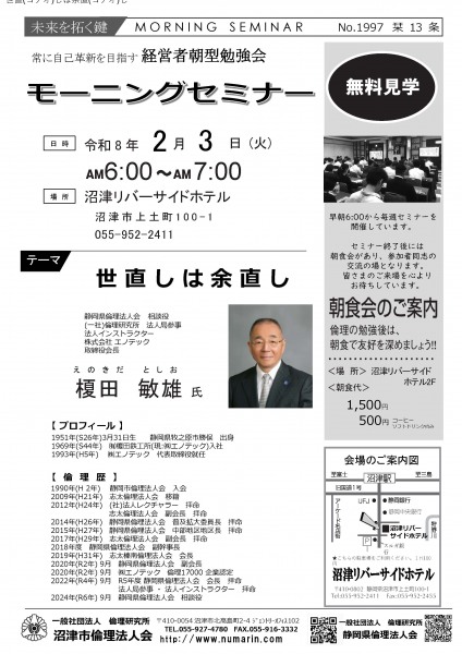 | 02月03日 | 榎田 敏雄 氏 | 静岡県倫理法人会 相談役、法人インストラクター、(株)エノテック 取締役会長 世直しは余直し |