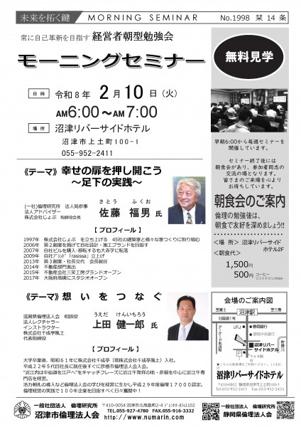 | 02月10日 | 佐藤福男氏、上田健一郎氏 氏 | 法人アドバイザー、法人インストラクター 幸せの扉を押し開こう~足下の実践~、想いをつなぐ |