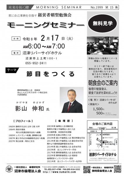 | 02月17日 | 影山 伸和 氏 | 静岡県倫理法人会 相談役、あんしんビジネスサポート(株) 代表取締役 節目をつくる |
