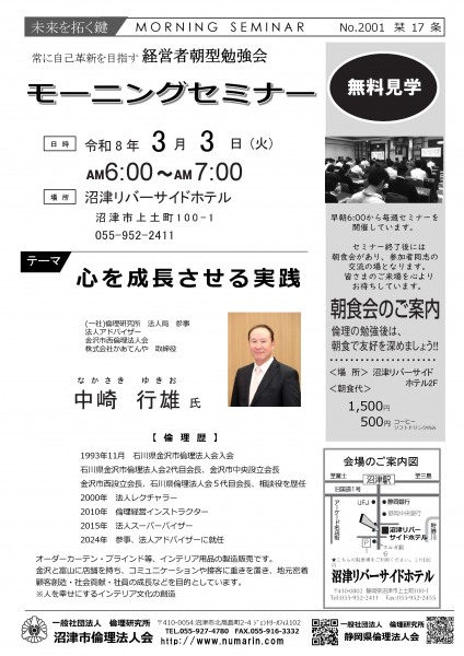 | 03月31日 | 佐藤 将吾 氏 | 沼津北倫理法人会 株式会社アスナロカン 倫理経営塾での学び |