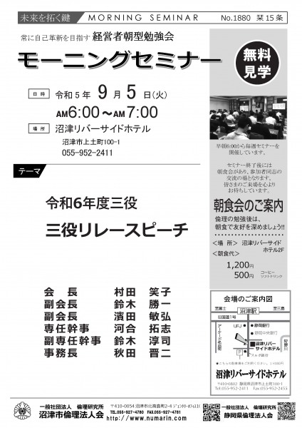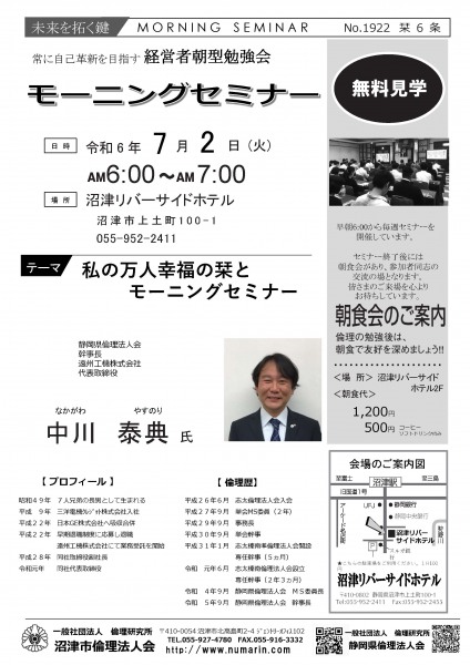 | 07月02日 | 中川 泰典 氏 | 静岡県倫理法人会 幹事長、遠州工機株式会社 代表取締役 私に万人幸福の栞とモーニングセミナー |