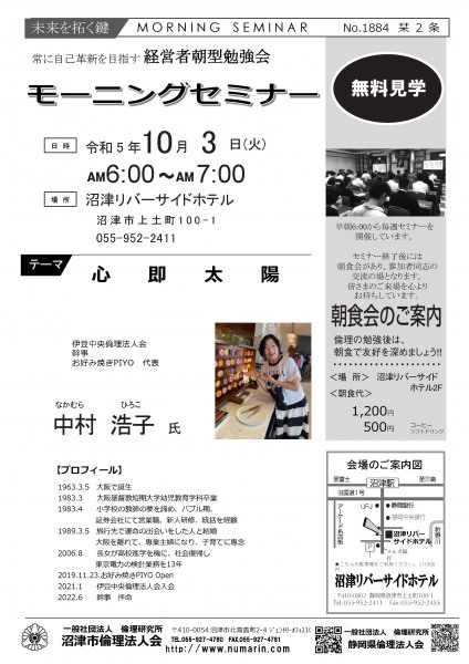 | 10月03日 | 中村 浩子 氏 | 伊豆中央倫理法人会 幹事、お好み焼きPIYO代表 笑顔満開太陽みたいな人 |