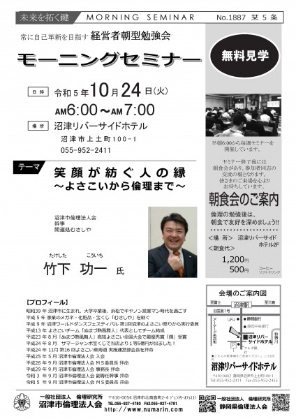 | 10月24日 | 竹下 功一 氏 | 沼津市倫理法人会 MS委員 笑顔が紡ぐ人の縁 ~よさこいから倫理まで~ |
