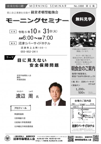 | 10月31日 | 渡辺 周 氏 | 沼津市倫理法人会 顧問、衆議院議員 目に見えない安全保障問題 |