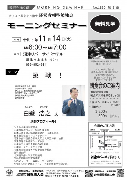 | 11月14日 | 白壁 浩之 氏 | 沼津市倫理法人会 幹事、シラカベ歯科 院長 挑戦 |