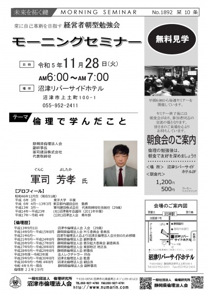 | 11月28日 | 軍事 芳孝 氏 | 静岡倫理法人会 副幹事長 倫理で学んだこと |