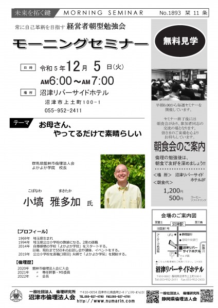 | 12月26日 | 西村嘉洋 氏 | 沼津市倫理法人会 朝礼委員、宅配クック1・2・3 沼津三島店 祖先と倫理のおかげ |