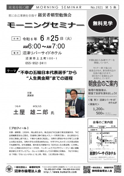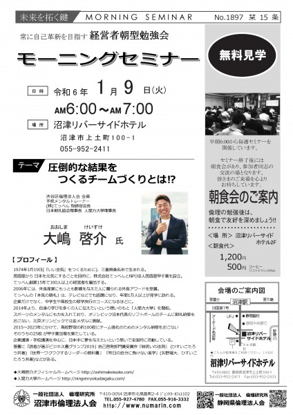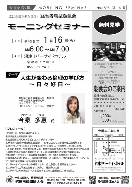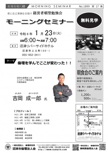 | 01月23日 | 吉岡 成一郎 氏 | 沼津北倫理法人会 専任幹事 倫理を学んでここが変わった!! |