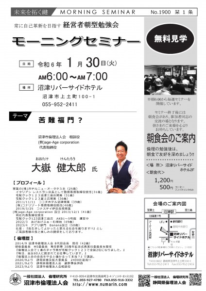 | 01月30日 | 大嶽 健太郎 氏 | 沼津市倫理法人会 相談役、(株)age-Age corporation 代表取締役 苦難福門? |