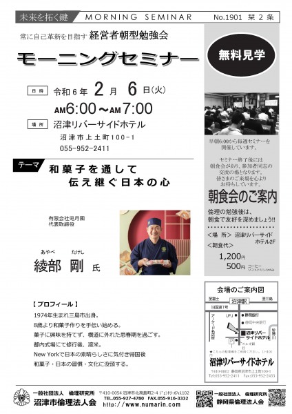 | 02月06日 | 綾部 剛氏 氏 | 有限会社兎月園 代表取締役 和菓子を通して伝え継ぐ日本の心 |