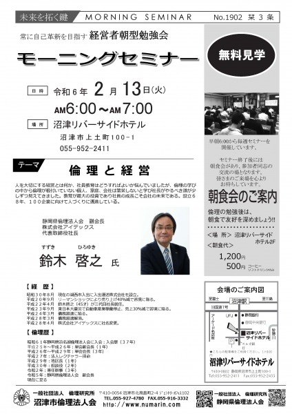 | 02月13日 | 鈴木 啓之 氏 | 静岡県倫理法人会 副会長、(株)アイデックス代表取締役 社長 倫理と経営 |