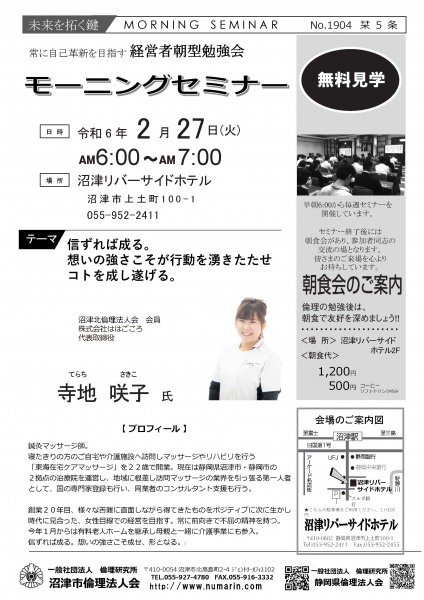 | 02月27日 | 寺地 咲子 氏 | 沼津北倫理法人会 会員、(株)ははごころ 代表取締役 信ずれば成る。想いの強さこそが行動を湧きたたせ、コトを成し遂げる。 |