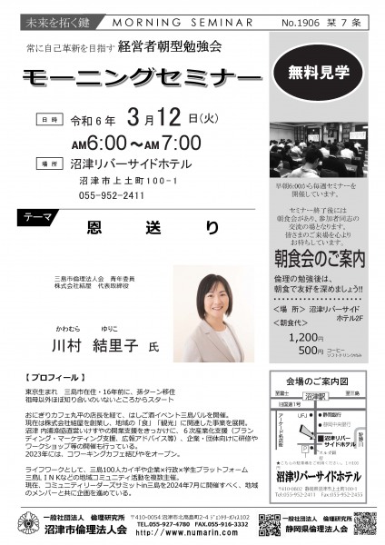 | 03月12日 | 川村結里子 氏 | 三島市倫理法人会 青年委員、(株)結屋 代表取締役 恩送り |