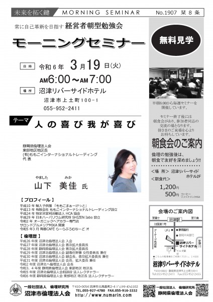 | 03月19日 | 山下美佳 氏 | 静岡県倫理法人会 東部地区長、(有)モモコインターナショナルトレーディング代表 人の喜び我喜び |