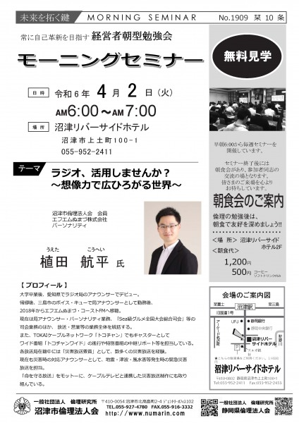 | 04月09日 | 鈴木 大海 氏 | 沼津市倫理法人会 青年委員、IRコモンズ(株) 夫婦は一対の反射鏡~組織の最小単位は家庭~ |