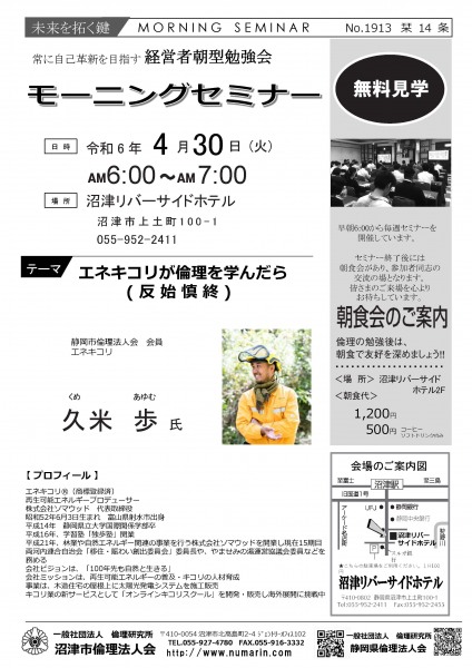| 04月30日 | 久米 歩 氏 | 静岡市倫理法人会 会員、エネキコリ エネキコリが倫理を学んだら(反始慎終) |