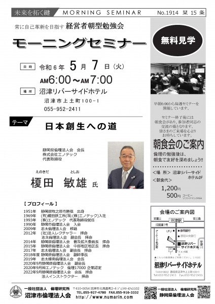 | 05月07日 | 榎田 敏雄 氏 | 静岡県倫理法人会会長、(株)エノテック 代表取締役 日本創生への道 |
