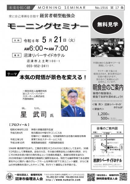 | 05月21日 | 星 武司 氏 | 逗子市倫理法人会 法人スーパーバイザー 本気の覚悟が景色を変える! |