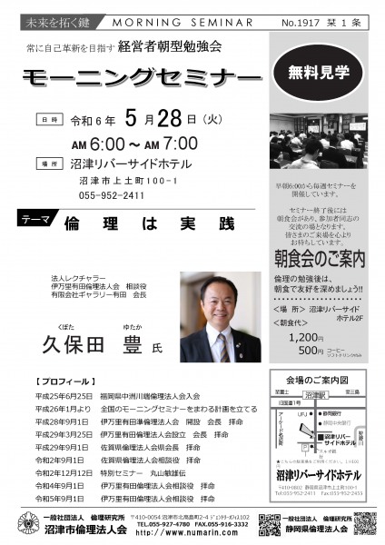 | 05月14日 | 村木 豊 氏 | 沼津北倫理法人会 事務長、沼津市議会議員 逆引き 万人幸福の栞~あの時のあの行動は正しかったのか!?~ |