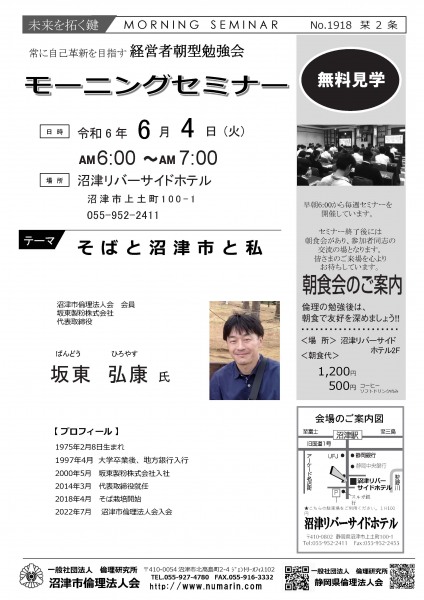 | 06月04日 | 坂東 弘康 氏 | 沼津市倫理法人会 幹事、坂東製粉(株)代表取締役 そばと沼津市と私 |