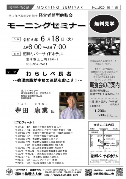 | 06月18日 | 豊田 康業 氏 | 埼玉県倫理法人会 研修委員長、(有)豊田彫刻工房 代表取締役 わらしべ長者~倫理実践が幸せの連鎖をおこす!~ |