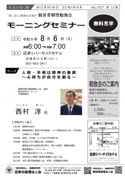 | 08月06日 | 西村 淳 氏 | 静岡市駿河準倫理法人会 株式会社オリオール 代表取締役 人相・手相は精神の象徴~心持ちが自分を創る~ |