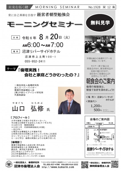 | 08月20日 | 山口 弘修 氏 | 法人スーパーバイザー、(株)中部シイアイシー研究所 倫理実践!会社と家庭どうかわったの? |