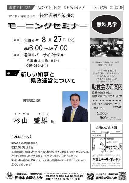 | 08月27日 | 杉山 盛雄 氏 | 静岡県議会議員 地域の未来を創る持続可能な発展と県民の幸福を目指して |